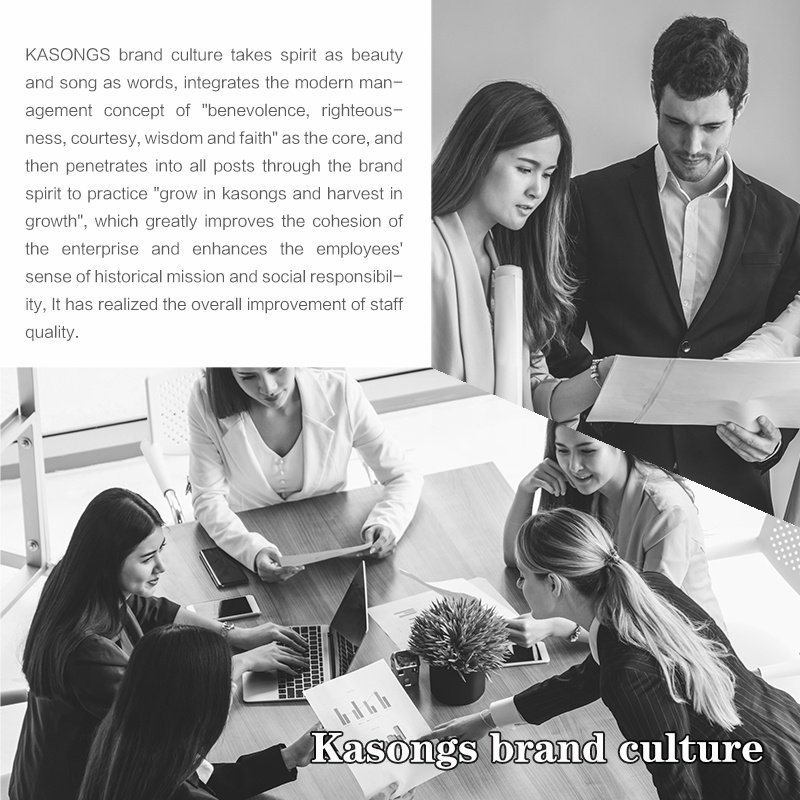 KASONGS brand culture takes spirit as beauty and song as words, integrates the modern management concept of "benevolence, righteousness, courtesy, wisdom and faith" as the core, and then penetrates into all posts through the brand spirit to practice "grow in kasongs and harvest in growth", which greatly improves the cohesion of the enterprise and enhances the employees' sense of historical mission and social responsibility, It has realized the overall improvement of staff quality.